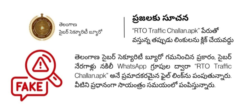 ట్రాఫిక్ చలాన్ పేరుతో లింక్స్ వస్తే తొందరపడొద్దు – చేస్తే తప్పదు భారీనష్టం – TELANGANA CYBER SECURITY BUREAU ట్రాఫిక్ చలాన్ల పేరిట ఏపీకే ఫైల్స్